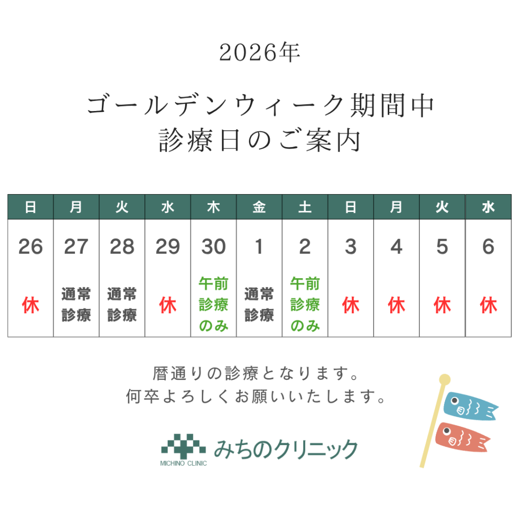 ゴールデンウィーク期間中診療日のご案内 投稿日 2026年4月16日 著者 hmhsaa5@gmail.com カテゴリー 最新のお知らせ ツイート GWのお知らせです。当院は【暦通り】の診療時間になります。何卒よろしくお願いいたします。